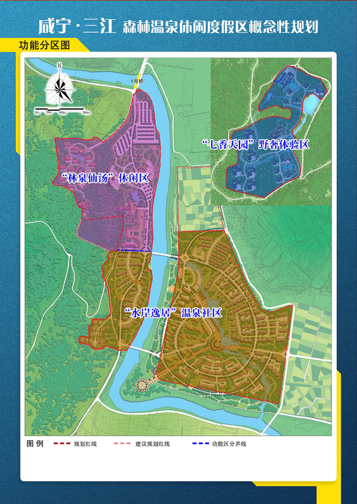 (1)“林泉仙湯”休閑區(qū)(2)“水案逸居”度假社區(qū)(3)“七香天園”野奢體驗(yàn)區(qū)