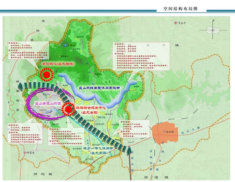 整個盤山休閑度假區(qū)基本布局在遵循片區(qū)地形地貌和相關(guān)產(chǎn)業(yè)已有格局的基礎(chǔ)上,以地塊開發(fā)條件分析為依據(jù),將官莊“大盤山”區(qū)域內(nèi)旅游產(chǎn)業(yè)發(fā)展格局確定為“雙心、兩帶、一區(qū)”的基本形態(tài)。