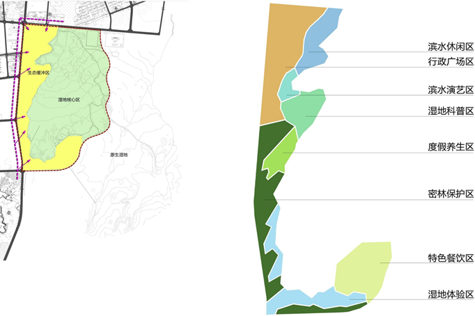 通過對周邊功能、用地性質(zhì)和交通的分析。得到結(jié)論是是:城市無序發(fā)展已經(jīng)導(dǎo)致濕地退化。當(dāng)下應(yīng)重點(diǎn)建設(shè)城市邊界的生態(tài)緩沖帶; 集中資源打造景觀亮點(diǎn);以最少的投入獲取最大的效益。