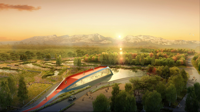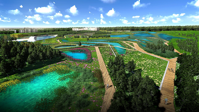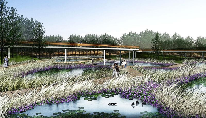 設(shè)計(jì)以最小干預(yù)為原則,采用整體保護(hù)、邊緣利用 的開發(fā)模式,集中力量建設(shè)城市邊緣的生態(tài)緩沖區(qū)。 打造一個(gè)“整體綠、局部精”的國家級濕地公園。