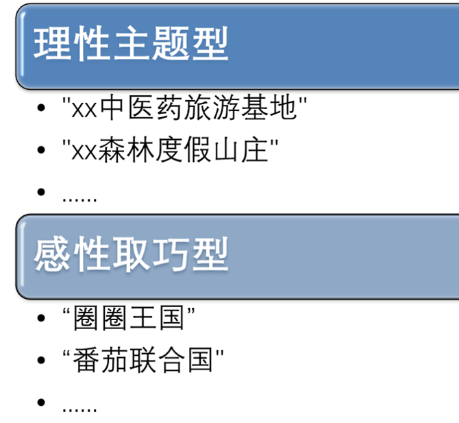 1、理性主題型如:XX生態(tài)農(nóng)業(yè)園; XX中醫(yī)藥旅游示范基地;xx森林度假山莊——這種命名法的好處一是直...