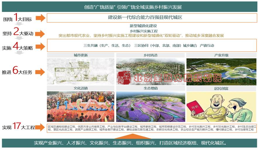 圍繞建設(shè)新一代綜合能力百強縣現(xiàn)代城區(qū)的總目標(biāo),堅持新型城鎮(zhèn)化建設(shè)和鄉(xiāng)村振興“雙輪驅(qū)動”,實施三生共融(生產(chǎn)、生活、生態(tài))、三區(qū)協(xié)同(中部、南部、北部)、城鄉(xiāng)融合、產(chǎn)鎮(zhèn)互動“四大策略”,推進城市更新、鄉(xiāng)村再造、產(chǎn)業(yè)升級、文化活鎮(zhèn)、生態(tài)增值、居民創(chuàng)富“六大重點任務(wù)”,實施區(qū)域交通樞紐建設(shè)、城市有機更新、鄉(xiāng)村文化振興等“十七項重點工程”,實現(xiàn)產(chǎn)業(yè)振興、人才振興、文化振興、生態(tài)振興、組織振興,打造區(qū)域經(jīng)濟樞紐、現(xiàn)代化城區(qū)、城鄉(xiāng)融合發(fā)展新典范。