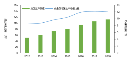 鎮(zhèn)域經(jīng)濟快速發(fā)展。地區(qū)生產(chǎn)總值從2012年的51.4億元快速增長到2018年的112億元,年均名義增速達13.9%,占全縣比重從2012年的8.72%穩(wěn)步增加到2018年12.03%,持續(xù)引領(lǐng)全縣經(jīng)濟發(fā)展,以城帶鄉(xiāng)的能力逐步增強。