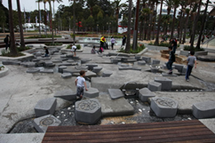 “貪”字迷宮沒有其它出口,只有上橋進(jìn)入“廉”字唯一出口; 而“廉”字迷宮有多個出口,這多個出口正好與旁邊水塘板塊連接成游憩路徑——這也正好寓意“貪無出路,廉為正道”。