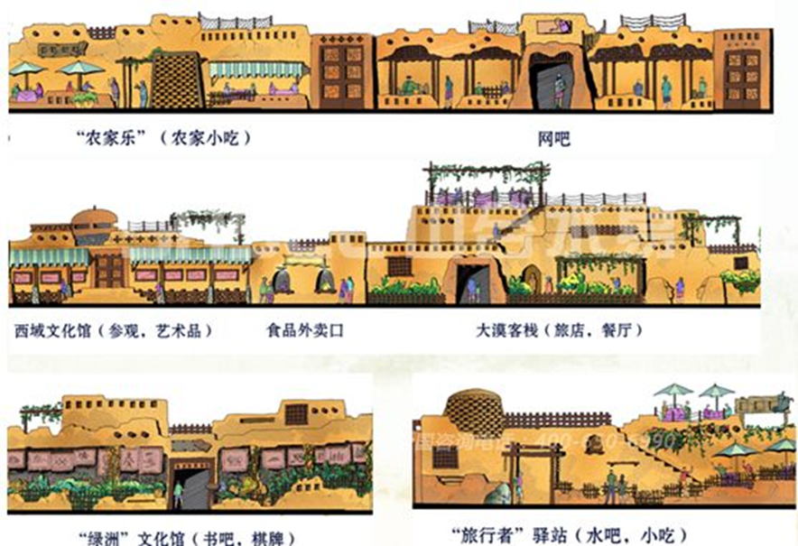 以“樓蘭魂”、“心靈驛站”、“天人合一”為文化氛圍的核心,打造豐富多彩的本土商業(yè)體系鏈。引入商業(yè)成為改造后街區(qū)主要贏利點,只有贏利才能維持街區(qū)運營因此特別重要。主要可考慮茶吧、水吧、書吧、棋牌吧、酒吧、網(wǎng)吧、藝術(shù)品銷售、紀念品銷售等。