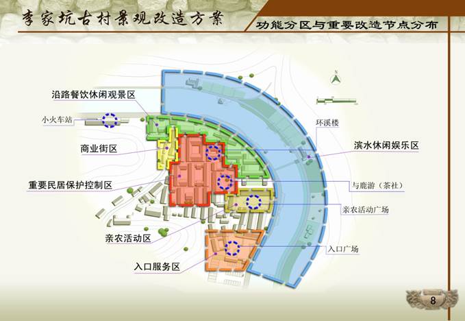 總體規(guī)劃基于原有文脈地脈,既注重古建筑保護(hù),同時(shí)導(dǎo)入現(xiàn)代旅游業(yè)態(tài).以章溪水自然地形為基礎(chǔ),規(guī)劃濱水與古村兩大板塊、六個(gè)主要功能區(qū)。