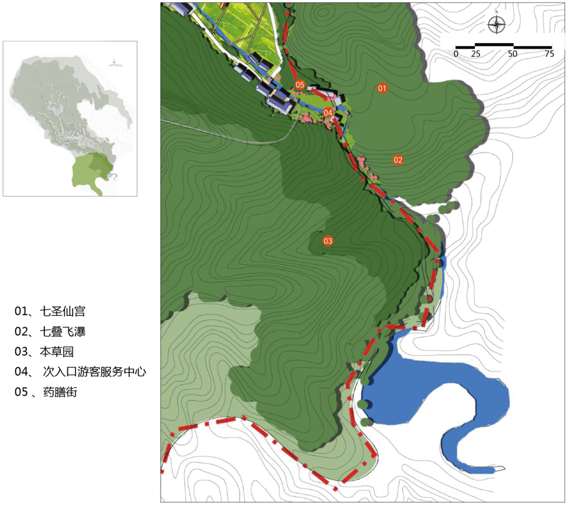 以山林生態(tài)涵養(yǎng)為主要功能,散種各種中草藥,以康體健身觀光為主要旅游內(nèi)容,配套游步道、旅游綜合服務(wù)設(shè)施。