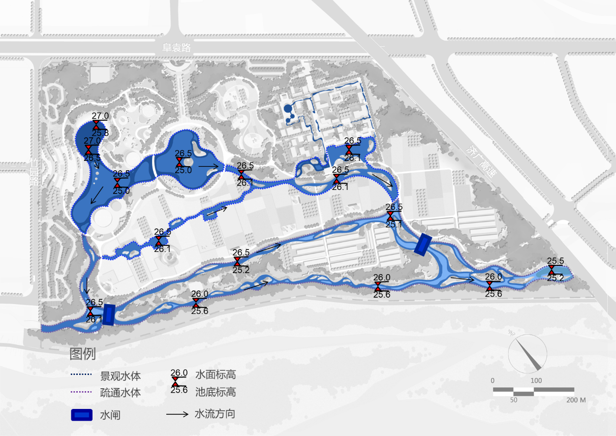 場地需要滿足部分行洪功能,規(guī)劃設(shè)置兩處水閘,以保證園區(qū)內(nèi)水體安全?,F(xiàn)狀場地內(nèi)水體面積約為3.8公頃,設(shè)計后的總體水體面積約為9.0公頃。北部設(shè)計為中心景觀水體;南部為濕地水體。通過雨水花園的規(guī)劃,收集場地雨水,補給公園用水。