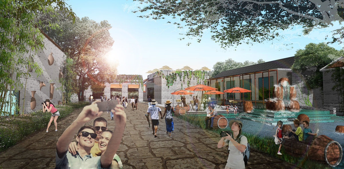 酒陶廣場:將酒局、陶器等器皿藝術(shù)化的嫁接為墻飾、廣場小品、公共座椅等。強化酒文化氛圍。