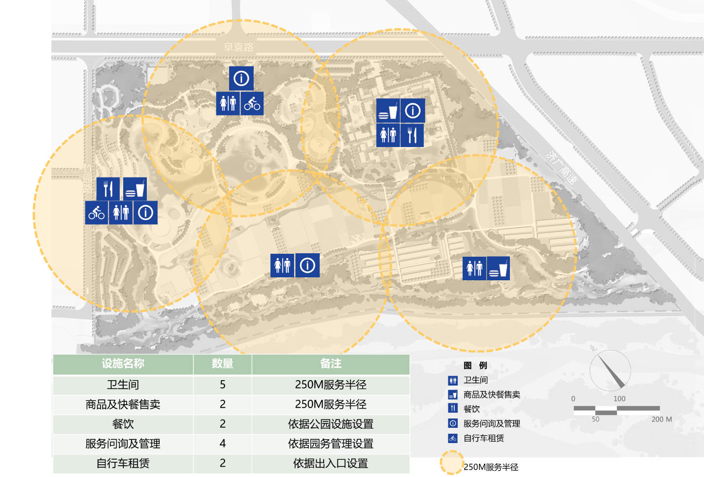 衛(wèi)生間、簡易售賣點按照250米服務(wù)半徑合理設(shè)置。其它服務(wù)設(shè)施根據(jù)交通線節(jié)點酌情布置。