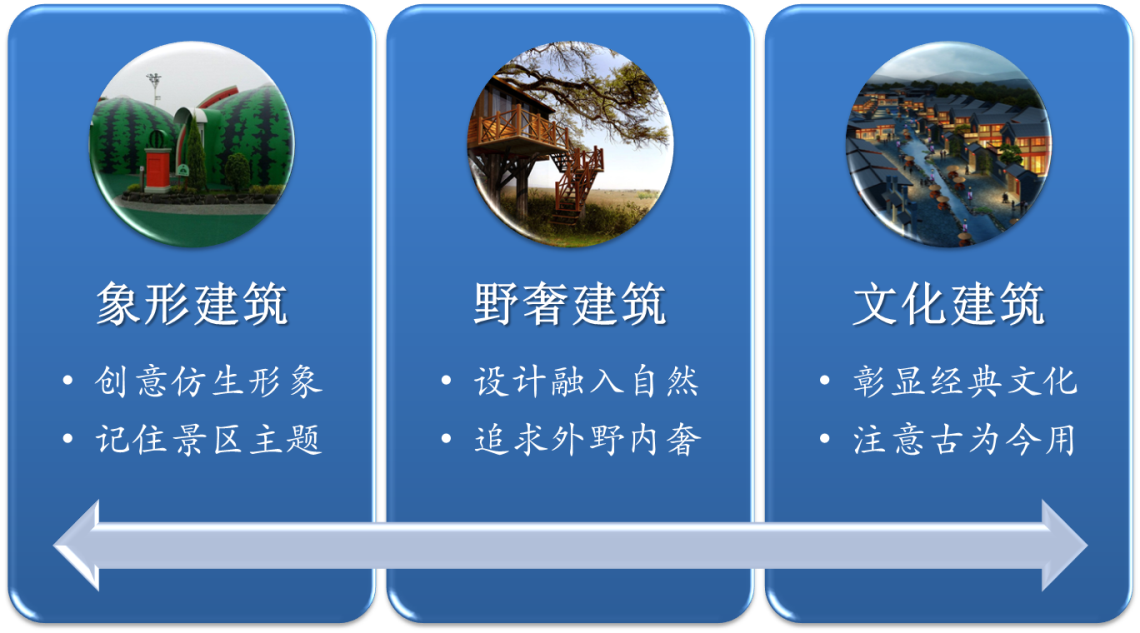 象形建筑設計:創(chuàng)意仿生形象,記住景區(qū)主題;野奢建筑設計:設計融入自然,追求外野內奢;文化建筑設計:萃取經典文化,注意古為今用。