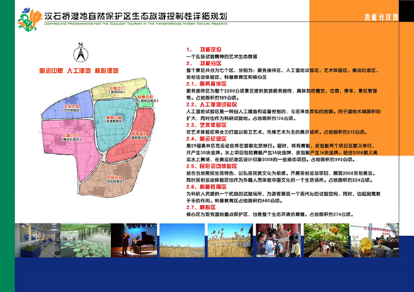 整個景區(qū)共分為七個區(qū),分別為:服務(wù)接待區(qū)、人工濕地試驗(yàn)區(qū)、藝術(shù)創(chuàng)新區(qū)、奧運(yùn)紀(jì)念區(qū)、民俗運(yùn)動體驗(yàn)區(qū)、科普教育區(qū)和濕地核心區(qū)。