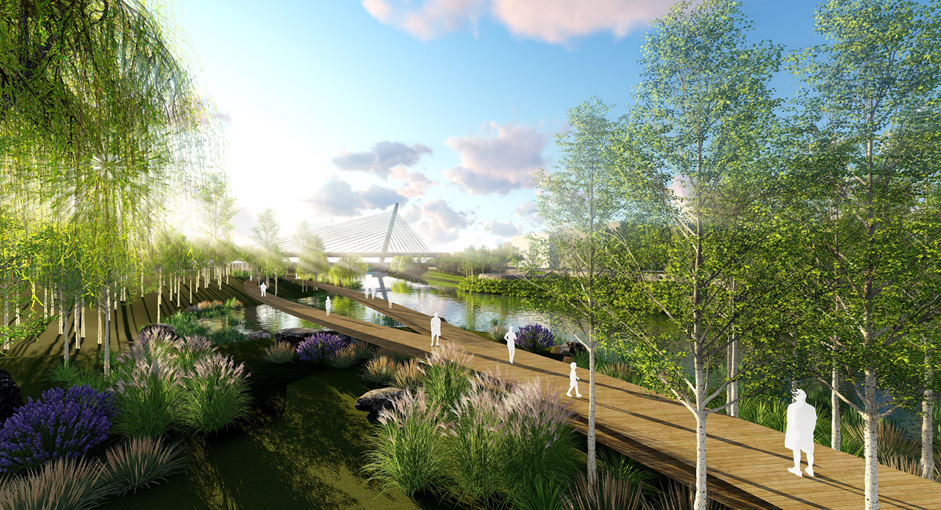 項目基地是煙臺黃金河入海一段。本次規(guī)劃設計范圍為天津南路橡膠壩以東至入??冢拥篱L度約 4.2 公里,河道寬度 140-170 米,總面積約 68.3 公頃,其中綠地面積約 11.5 公頃,水域面積約 56.8 公頃。