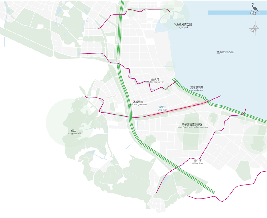 黃金河是煙臺經(jīng)濟開發(fā)區(qū)古現(xiàn)片區(qū)山城海河城市特色的最佳景觀載 體,是鏈接山 - 城 - 海的重要養(yǎng)生休憩及特色文化型景觀廊道。