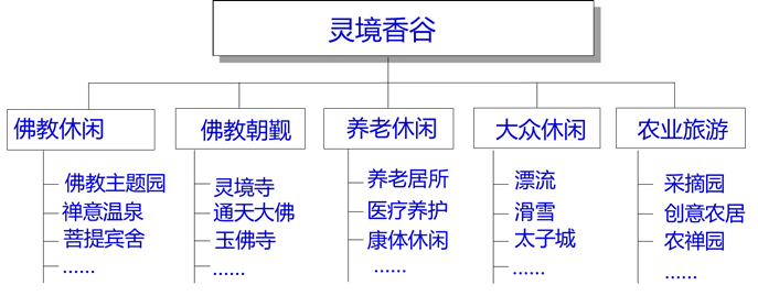 以“佛教休閑”為核心,涵蓋與聯(lián)動(dòng)“農(nóng)業(yè)開(kāi)發(fā)”、“傳統(tǒng)佛教朝覲祈?!?、“一般性觀光游樂(lè)”、“養(yǎng)老產(chǎn)業(yè)”。