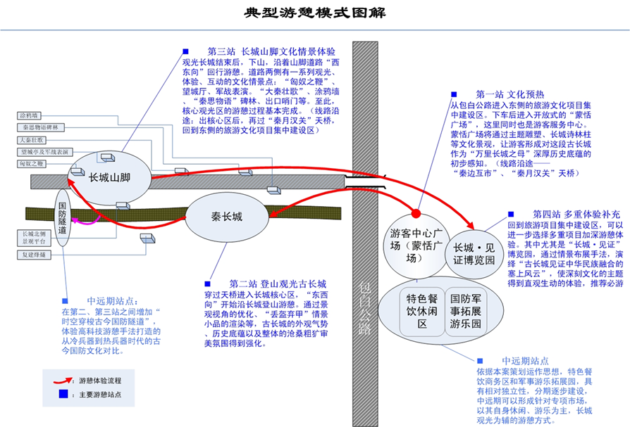4、最后,綜合上述策劃、規(guī)劃、設(shè)計(jì)成果,形成了秦長城旅游區(qū)自身獨(dú)特的游憩方式
