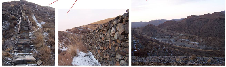 (現(xiàn)狀秦長城入口; 現(xiàn)狀秦長城半人高石頭墻; 50年代遺留解放軍兵營)