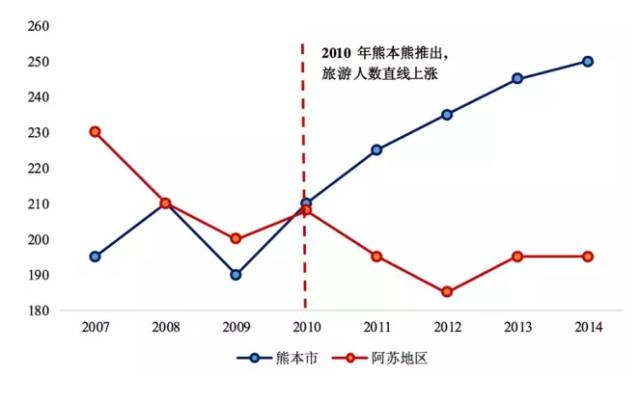 據(jù)統(tǒng)計(jì),在熊本熊橫空出世的5年內(nèi),熊本縣旅游人數(shù)增長了近20%,而同時(shí)期的隔壁阿蘇地區(qū),游客人數(shù)卻呈現(xiàn)出下滑趨勢,由此形成了鮮明對比。