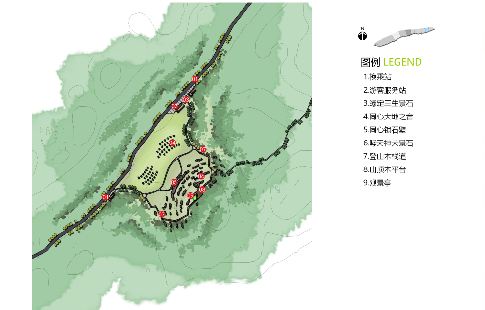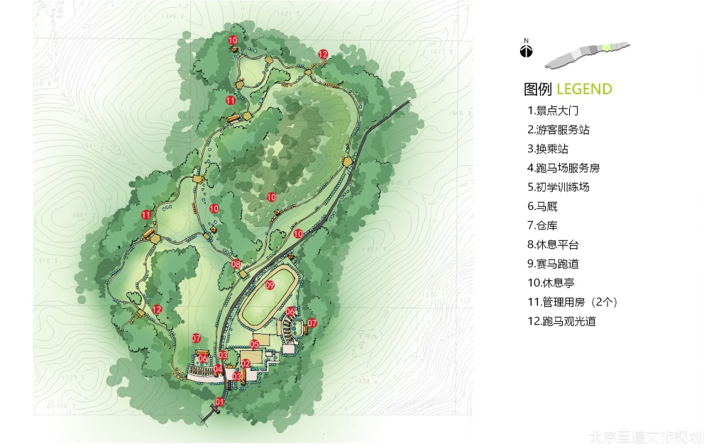 該區(qū)域以旅游觀光為主,禁止私家車進入,使用環(huán)保電瓶車組織車行交通,輔助以馬道和自行車道。集中展現(xiàn)齊岳山的“草、云、風(fēng)、光”四大賣點。