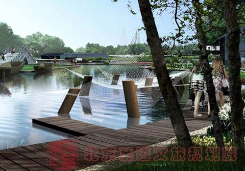 (人工的樁柱和船模之間,配備漁網,典型的“源于生活高于生活”景觀。樁網相連令人聯(lián)想漁家真實場景;同時人工美化的樁柱、以及船模與木棧臺,顯得干凈簡潔、藝術唯美)
