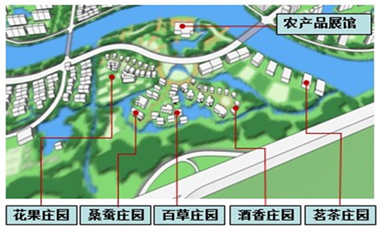 構(gòu)成:一個安康農(nóng)產(chǎn)品展覽館(列入市政工程),若干農(nóng)民企業(yè)莊園(如茗茶莊園、蠶桑莊園等)