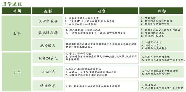 讓孩子在少年時期積淀足夠的國學文化素養(yǎng);讓孩子間溝通、合作、團結(jié)、信任、領(lǐng)導(dǎo)的能力得以綜合鍛煉